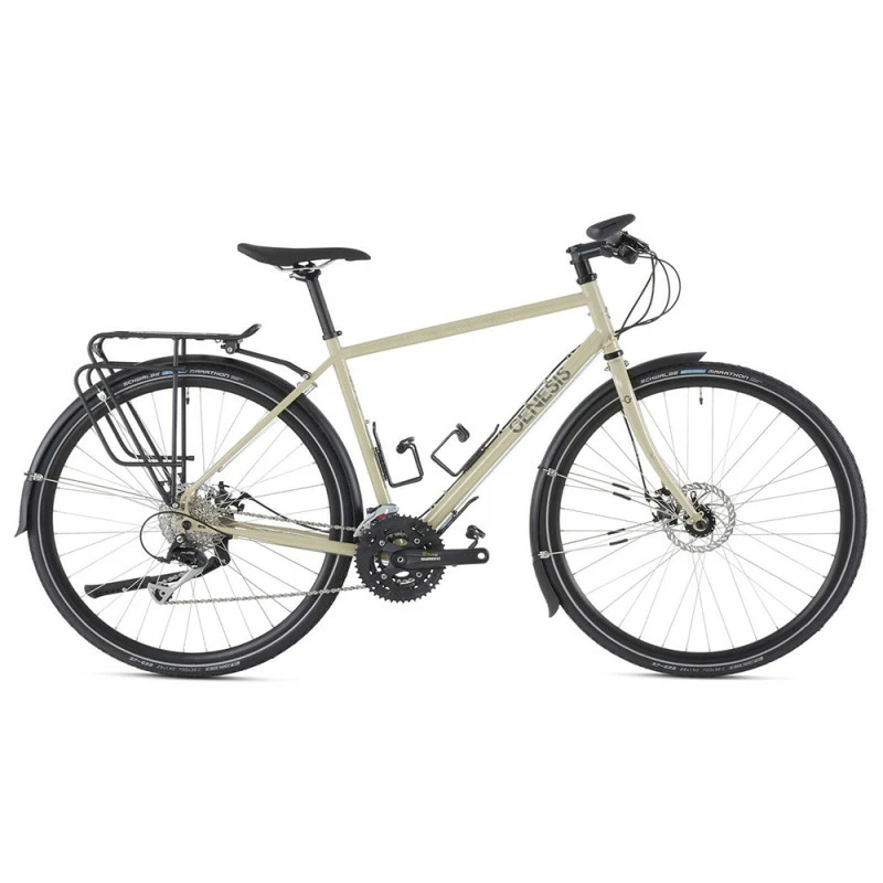 Ce vélo de randonnée Genesis Tour de Fer 10 FB va bien en voyage, en petite/grande randonnée, en ville. Polyvalent, durable, fiable, il sera un allié fidèle pour toutes vos aventures sur route, via les pistes cyclables, les voies vertes, les chemins roulants… Il fournit directement certains accessoires précieux : le porte-bagages arrière, les garde-boue, la béquille, les 3 (!) porte-bidons. Ses pneus Schwalbe Marathon (37 de section) ont une durée de vie maximale et une grande résistance à la crevaison (protection GreenGuard et flancs anti-âge).