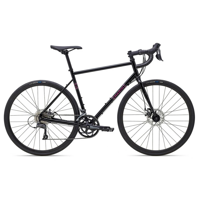 Marin Bikes recherche la fiabilité en choisissant des composants d’entrée de gamme à la qualité irréprochable. C’est le cas des dérailleurs Shimano Claris et des freins à disque mécaniques Promax Render R. La transmission est complétée par un pédalier FSA Compact (avec 2 plateaux de 34/50 dents) et une cassette SunRace (8 vitesses sur une amplitude 11-32 dents). Marin Bikes fournit les différents périphériques, comme le guidon route, qui présente un flare de 12° (évasement extérieur) pour offrir un bon contrôle “les mains en bas”.