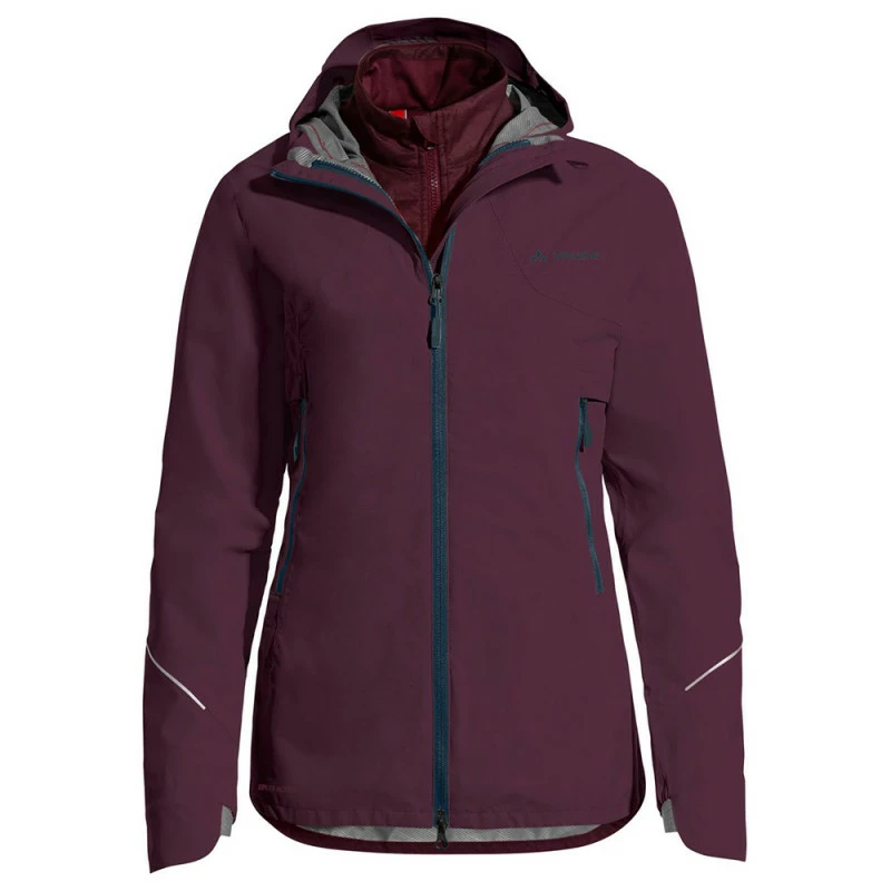 Cette veste vélo femme Vaude Yaras 3in1 propose des manches préformées, une capuche réglable avec un col haut, des zones d’aération, des éléments réfléchissants et des poches étanches.