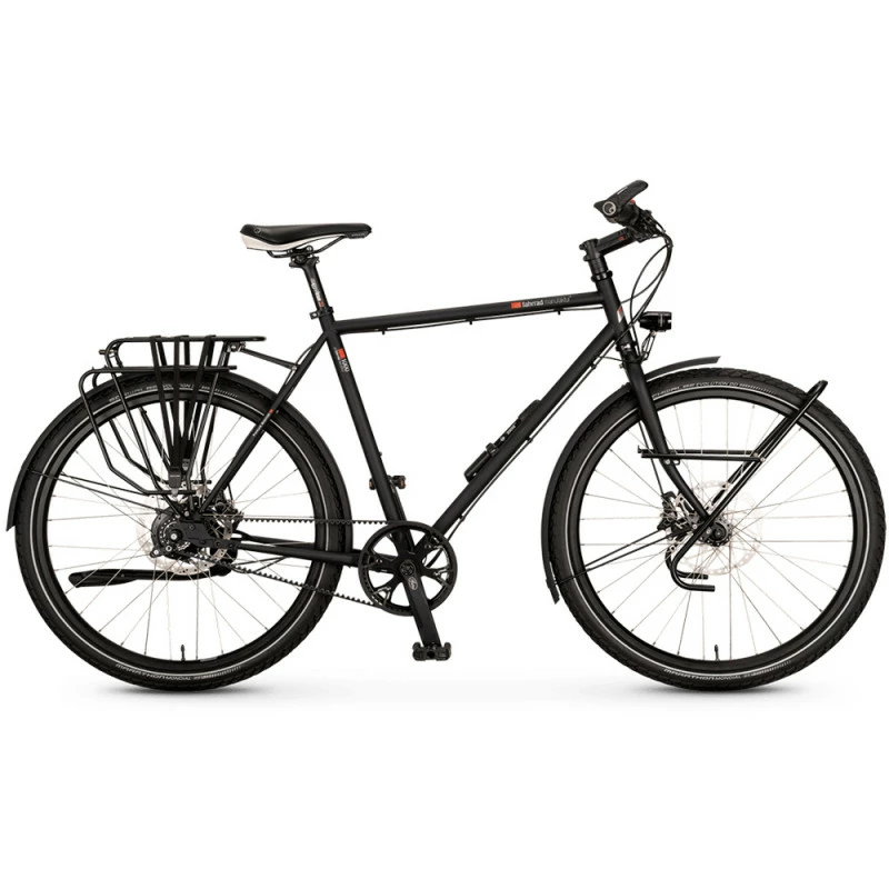 Ce vélo de randonnée VSF Fahrradmanufaktur TX-1000 reçoit des pièces très réputées dans l’univers du vélo de voyage. Les pneus Schwalbe Marathon Mondial ont une longévité exceptionnelle et un profil polyvalent route/chemin terre ou gravier. Vous avez des freins à disque haute performance Shimano Deore XT et une excellente transmission Rohloff, avec un choix de 14 vitesses et une plage de développement très confortable de 536 %. La fiabilité sur le (très) long terme du système Rohloff n’est plus à démontrer ! La combinaison avec la courroie Gates CDX permet de réduire au strict minimum les opérations de maintenance de la transmission.